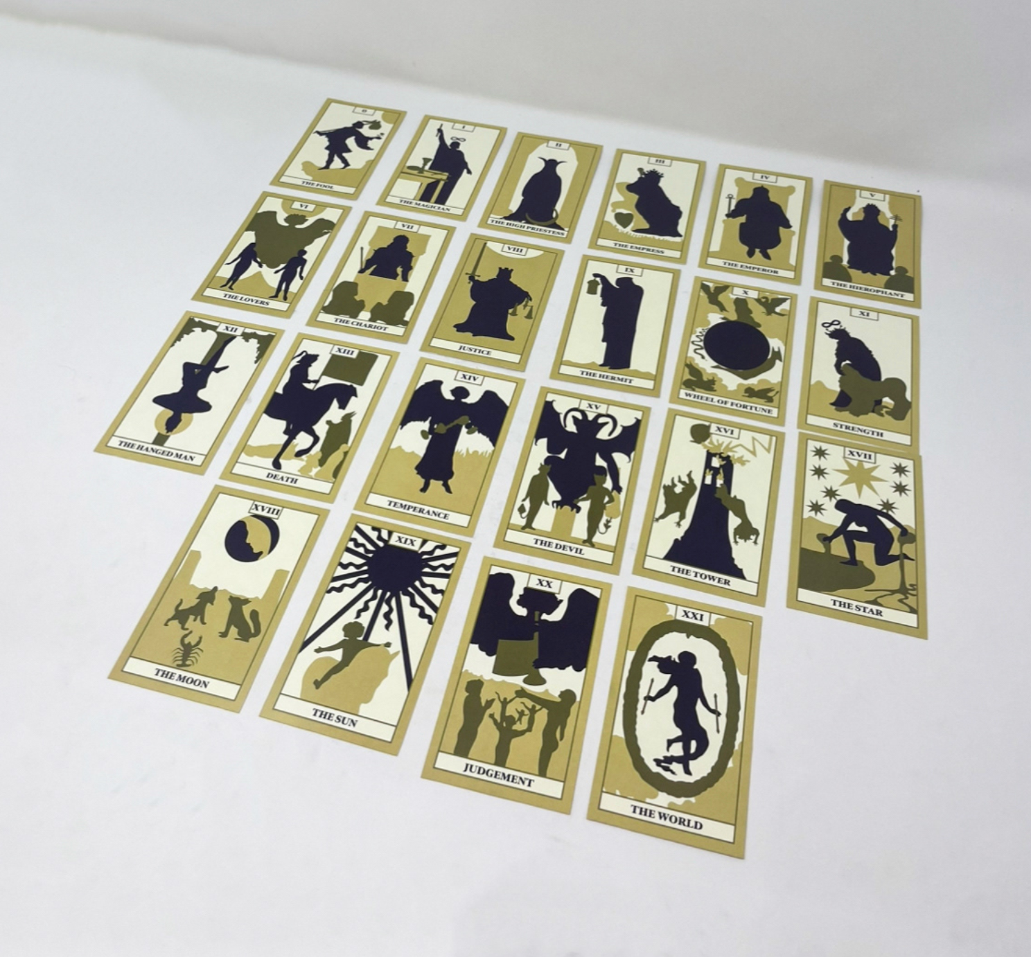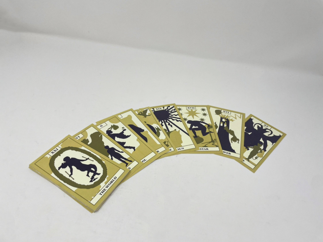 This project is a custom set of tarot cards, including the 22 main arcana cards and a box to hold them. These cards have a minimal style that utilizes silhouettes and a limited color palette.