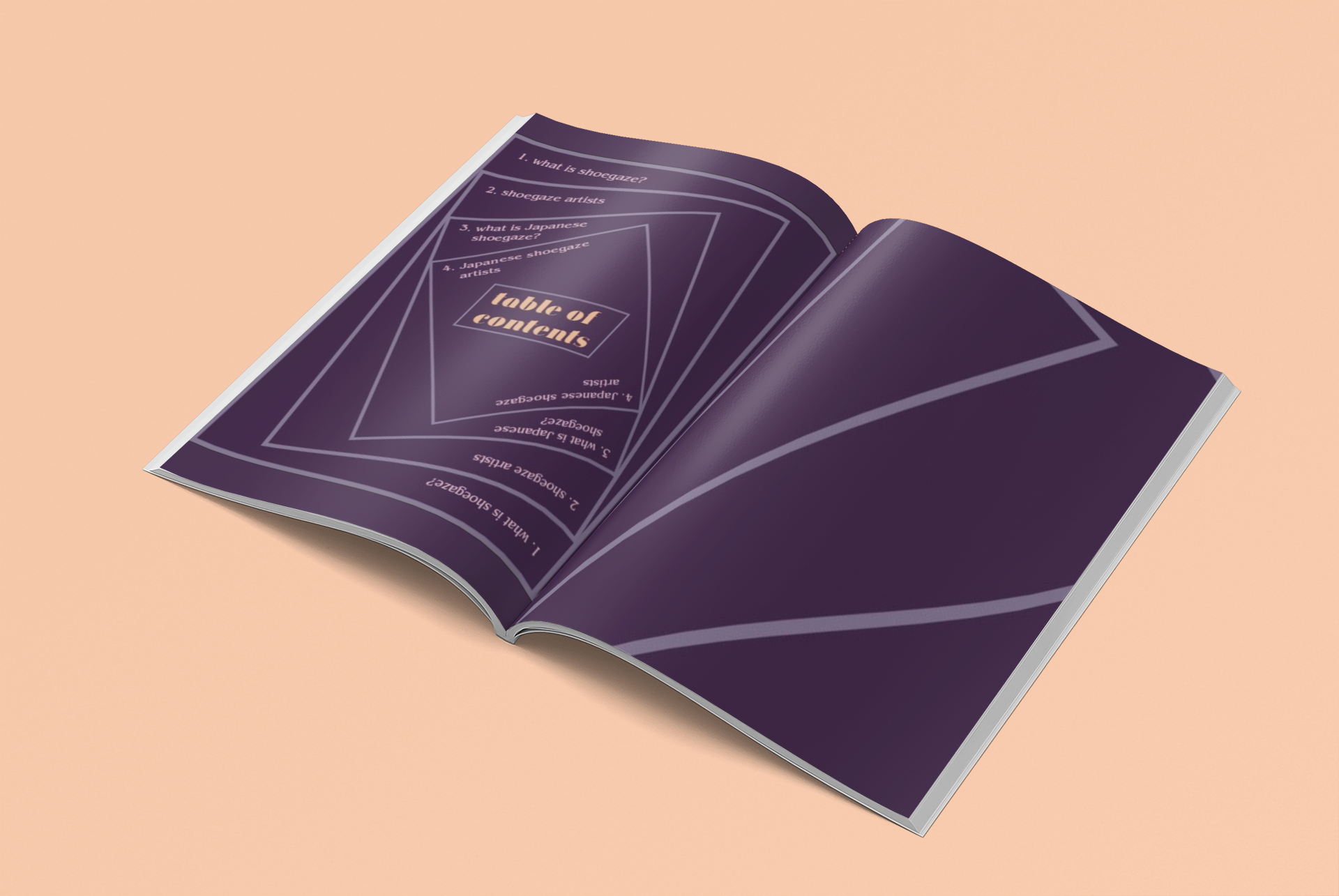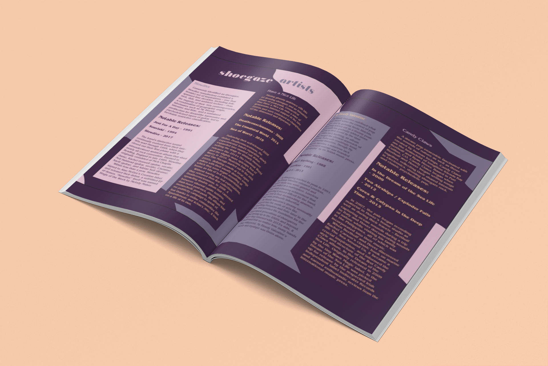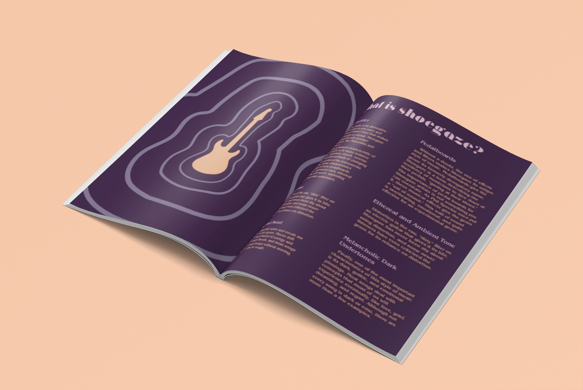 This project is a booklet about a genre of music called shoegaze, including what it is, important artists of the genre, e.t.c. The book's visual style utilizes dreamlike imagery, minimal icons, and a striking color palette.